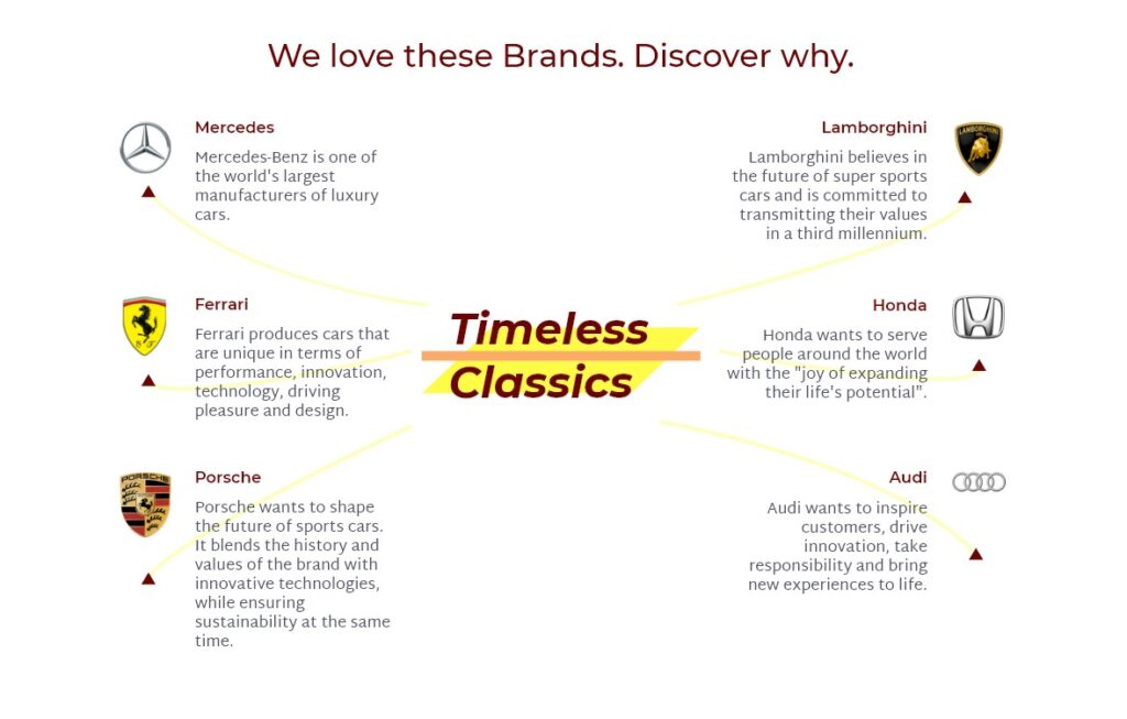 In questa sezione ho progettato un layout a forma di fiore. Ho inserito vari marchi che vengono venduti dall’azienda Timeless Classics.